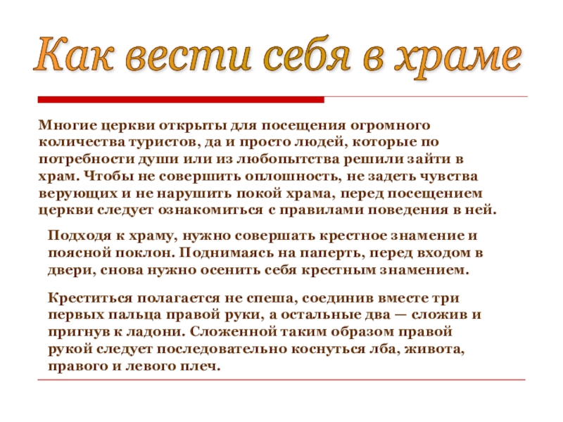Подходя к храму, нужно совершать крестное знамение и поясной поклон. Поднимаясь на паперть, перед входом в двери, снова нужно осенить себя крестным знамением.