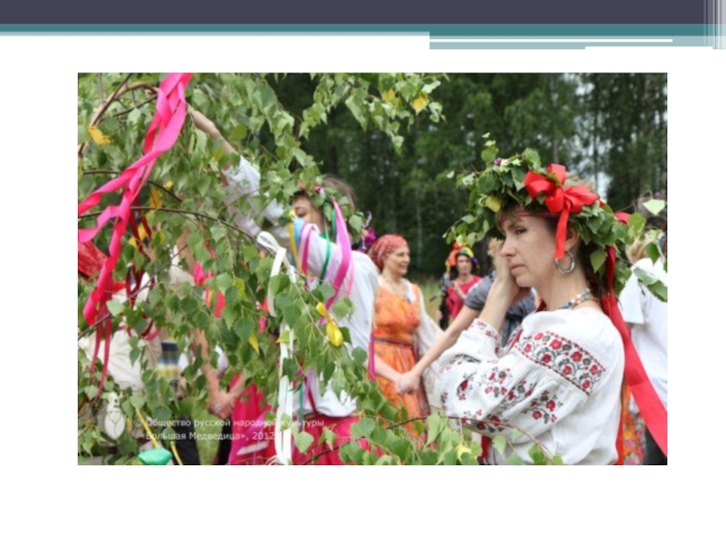 триединство Бога Отца, Бога Сына и Бога Святого Духа. Отмечают его в седьмое воскресенье после Пасхи. На Троицу принято было украшать храмы и дома зелеными ветками, цветами и травами. Полы устилали чабрецом, аиром и другими травами, в кувшинах и вазах ставили цветы, у иконостасов — березовые ветки. Береза считалась Божиим деревом. Девушки украшали ее лентами и цветами, водили вокруг нее хороводы (цветы и зелень — знак жизни).