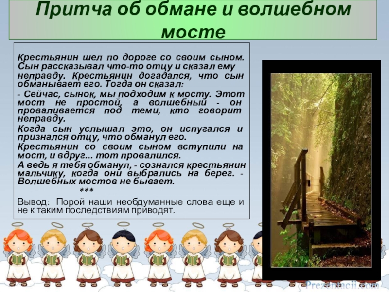 - Сейчас, сынок, мы подходим к мосту. Этот мост не простой, а волшебный - он проваливается под теми, кто говорит неправду.