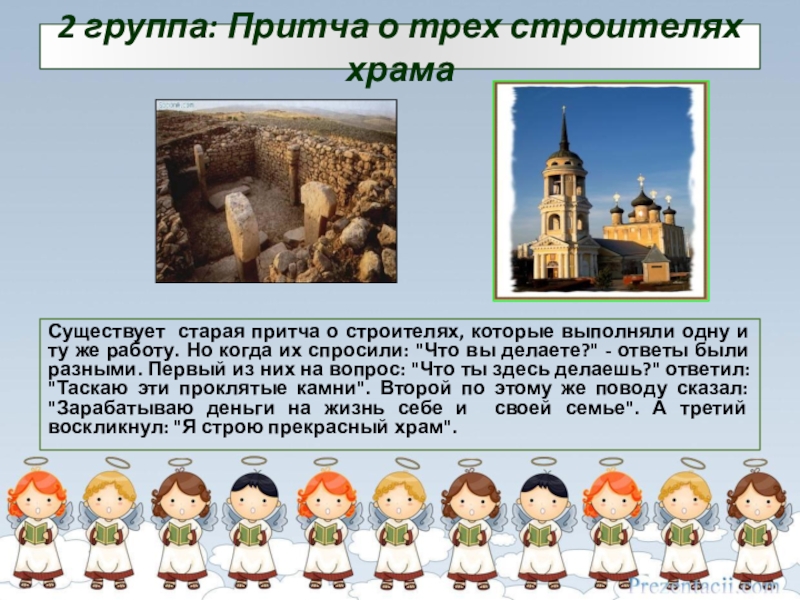 которые выполняли одну и ту же работу. Но когда их спросили: "Что вы делаете?" - ответы были разными. Первый из них на вопрос: "Что ты здесь делаешь?" ответил: "Таскаю эти проклятые камни". Второй по этому же поводу сказал: "Зарабатываю деньги на жизнь себе и своей семье". А третий воскликнул: "Я строю прекрасный храм".