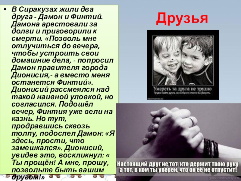 за долги и приговорили к смерти. «Позволь мне отлучиться до вечера, чтобы устроить свои домашние дела, - попросил Дамон правителя города Дионисия,- а вместо меня останется Финтий». Дионисий рассмеялся над такой наивной уловкой, но согласился. Подошёл вечер, Финтия уже вели на казнь. Но тут, продравшись сквозь толпу, подоспел Дамон: «Я здесь, прости, что замешкался». Дионисий, увидев это, воскликнул: « Ты прощён! А мне, прошу, позвольте быть вашим другом!»