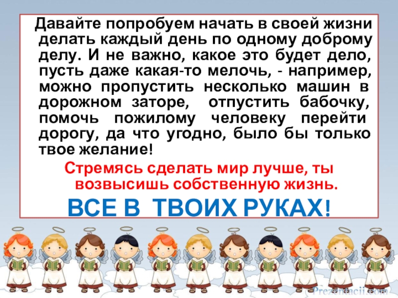 по одному доброму делу. И не важно, какое это будет дело, пусть даже какая-то мелочь, - например, можно пропустить несколько машин в дорожном заторе, отпустить бабочку, помочь пожилому человеку перейти дорогу, да что угодно, было бы только твое желание!