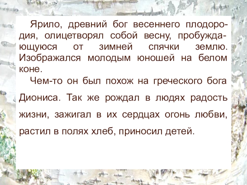 Ярило, древний бог весеннего плодоро-дия, олицетворял собой весну, пробужда-ющуюся от зимней