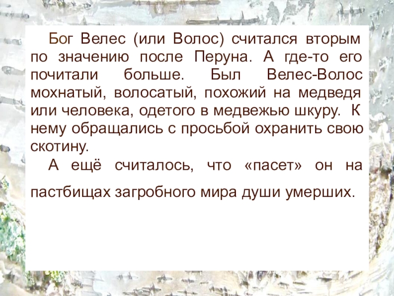 Бог Велес (или Волос) считался вторым по значению после Перуна. А