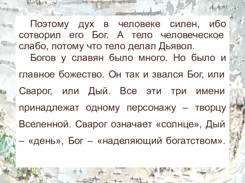 Богов у славян было много. Но было и главное божество. Он так и звался Бог, или Сварог, или Дый. Все эти три имени принадлежат одному персонажу – творцу Вселенной. Сварог означает «солнце», Дый – «день», Бог – «наделяющий богатством».