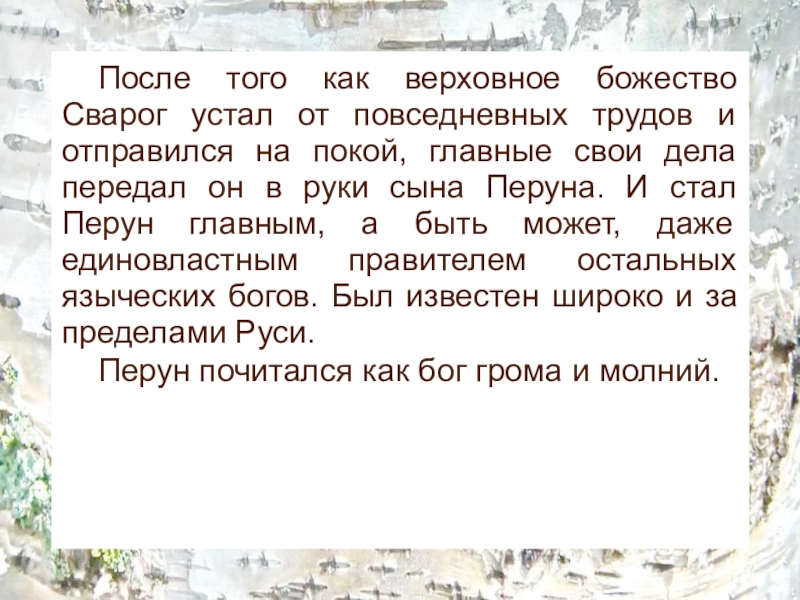 отправился на покой, главные свои дела передал он в руки сына Перуна. И стал Перун главным, а быть может, даже единовластным правителем остальных языческих богов. Был известен широко и за пределами Руси.