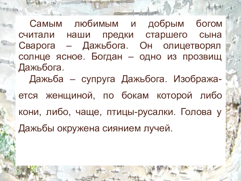 Дажьба – супруга Дажьбога. Изобража-ется женщиной, по бокам которой либо кони, либо, чаще, птицы-русалки. Голова у Дажьбы окружена сиянием лучей.