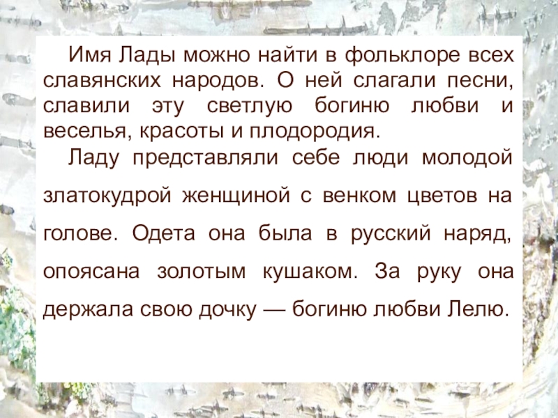 Имя Лады можно найти в фольклоре всех славянских народов. О ней