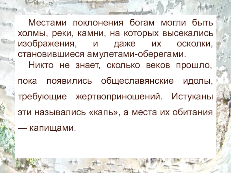 Никто не знает, сколько веков прошло, пока появились общеславянские идолы, требующие жертвоприношений. Истуканы эти назывались «капь», а места их обитания — капищами.