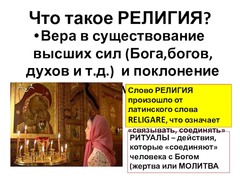 Слово РЕЛИГИЯ произошло от латинского слова RELIGARE, что означает «связывать, соединять»