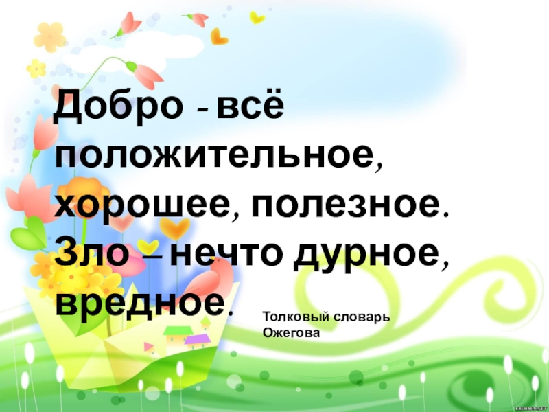 Добро - всё положительное, хорошее, полезное.Зло – нечто дурное, вредное.Толковый словарь Ожегова