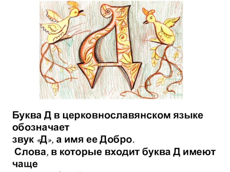 Буква Д в церковнославянском языке обозначает звук «Д», а имя ее Добро. Слова, в которые входит буква