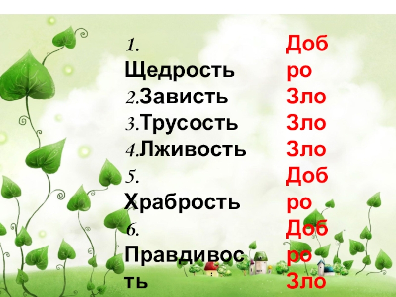 1.Щедрость2.Зависть3.Трусость4.Лживость5.Храбрость6.Правдивость7.Ненависть8.ЧуткостьДоброЗлоЗлоЗлоДоброДоброЗлоДобро