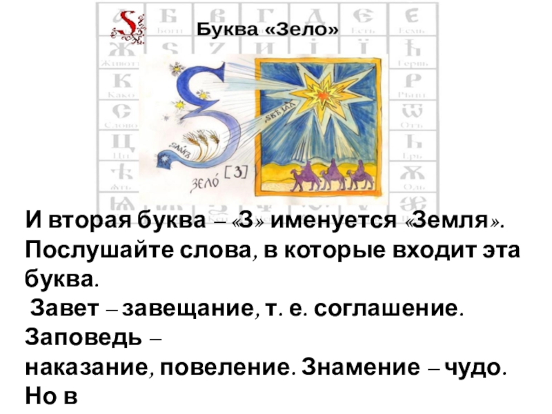 И вторая буква – «З» именуется «Земля». Послушайте слова, в которые входит эта буква. Завет – завещание,