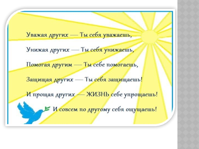 Слайд 10Уважать всякого человека, как самого себя, и поступать с ним, как