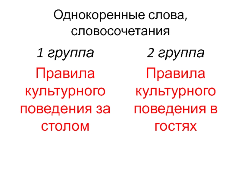 Однокоренные слова, словосочетания1 группаПравила культурного поведения за столом2 группаПравила культурного поведения в гостях