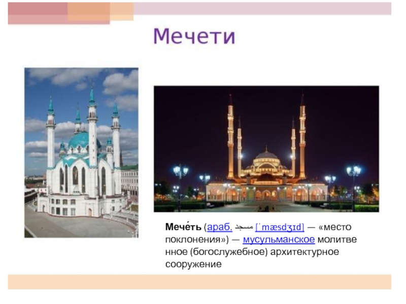 Слайд 16Мече́ть (араб. مسجد‎ [ˈmæsdʒɪd] — «место поклонения») — мусульманское молитвенное (богослужебное) архитектурное сооружение