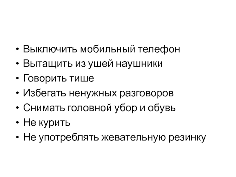 Выключить мобильный телефонВытащить из ушей наушникиГоворить тишеИзбегать ненужных разговоровСнимать головной убор и обувьНе куритьНе употреблять жевательную резинку