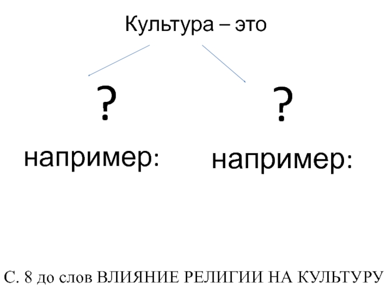 Культура – это  ?например: ?например:С. 8 до слов ВЛИЯНИЕ РЕЛИГИИ НА КУЛЬТУРУ