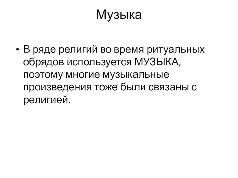 Музыка В ряде религий во время ритуальных обрядов используется МУЗЫКА, поэтому многие музыкальные произведения тоже были связаны