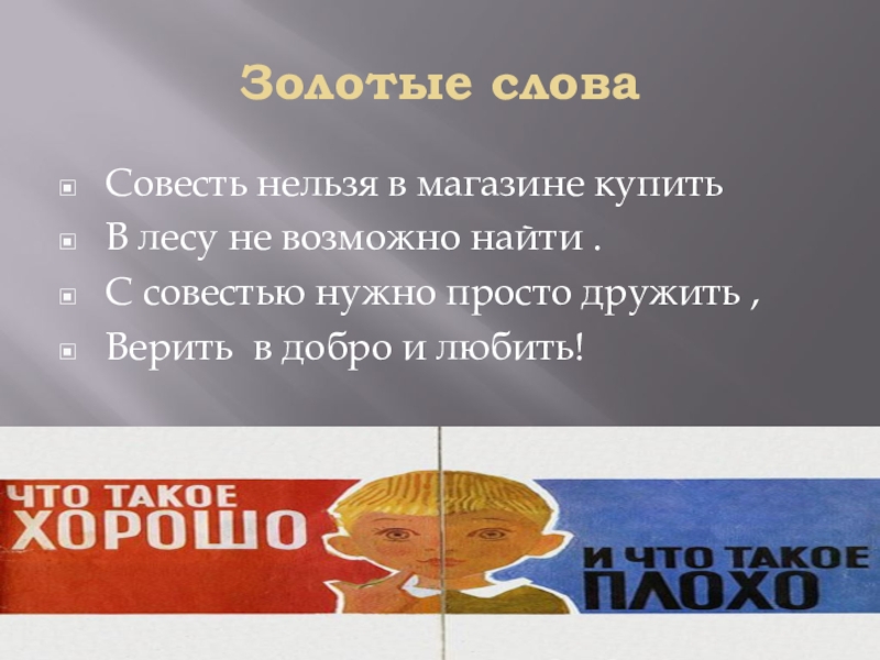 Золотые слова Совесть нельзя в магазине купить В лесу не возможно найти .С совестью нужно просто дружить