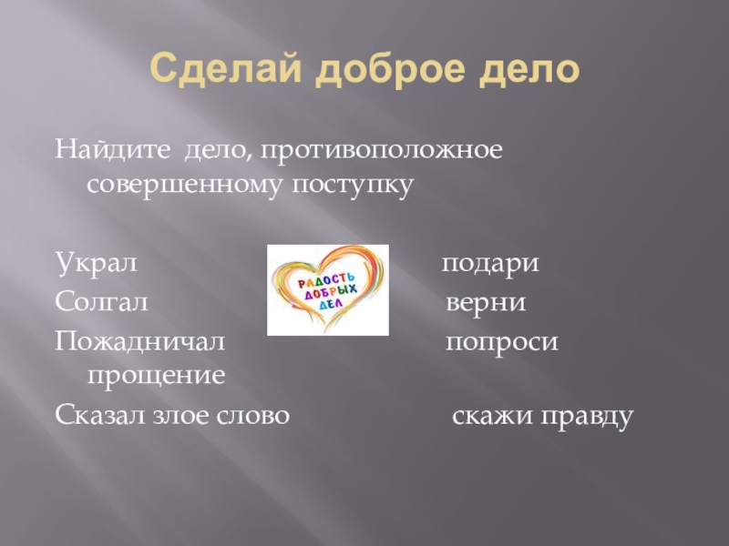 Сделай доброе делоНайдите дело, противоположное совершенному поступку Украл