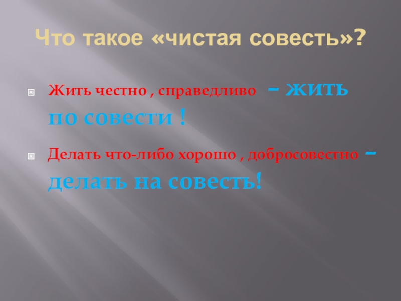 Что такое «чистая совесть»?Жить честно , справедливо  – жить по совести !Делать что-либо хорошо , добросовестно