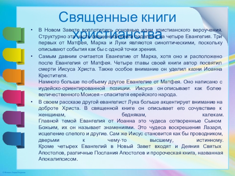 эта часть священной книги поделена на четыре Евангелия. Три первых от Матфея, Марка и Луки являются синоптическими, поскольку описывают события как бы с одной точки зрения.