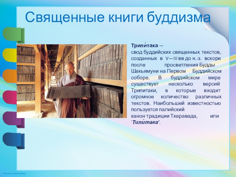 просветления Будды Шакьямуни на Первом Буддийском соборе. В буддийском мире существует несколько версий Трипитаки, в которые входит огромное количество различных текстов. Наибольшей известностью пользуется палийский канон традиции Тхеравада, или 'Типи́така'.