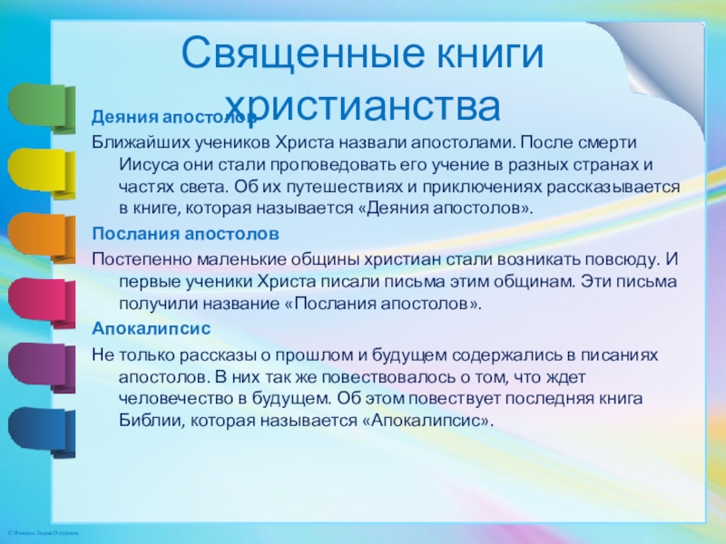 они стали проповедовать его учение в разных странах и частях света. Об их путешествиях и приключениях рассказывается в книге, которая называется «Деяния апостолов».