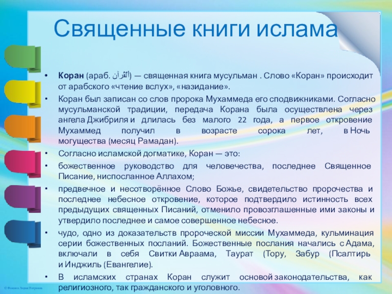Коран (араб. أَلْقُرآن) — священная книга мусульман . Слово «Коран» происходит от арабского «чтение вслух»,