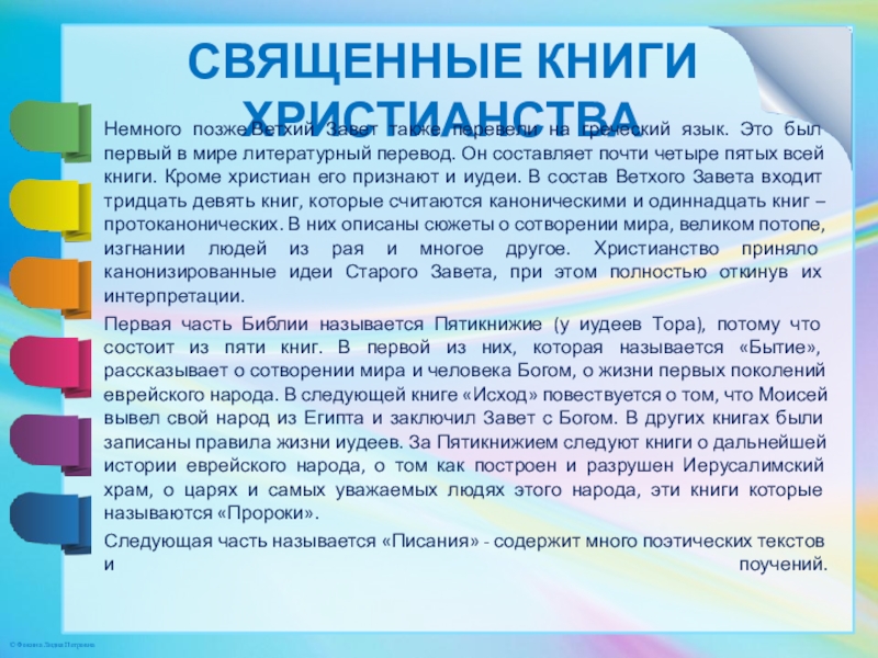 Первая часть Библии называется Пятикнижие (у иудеев Тора), потому что состоит из пяти книг. В первой из них, которая называется «Бытие», рассказывает о сотворении мира и человека Богом, о жизни первых поколений еврейского народа. В следующей книге «Исход» повествуется о том, что Моисей вывел свой народ из Египта и заключил Завет с Богом. В других книгах были записаны правила жизни иудеев. За Пятикнижием следуют книги о дальнейшей истории еврейского народа, о том как построен и разрушен Иерусалимский храм, о царях и самых уважаемых людях этого народа, эти книги которые называются «Пророки».