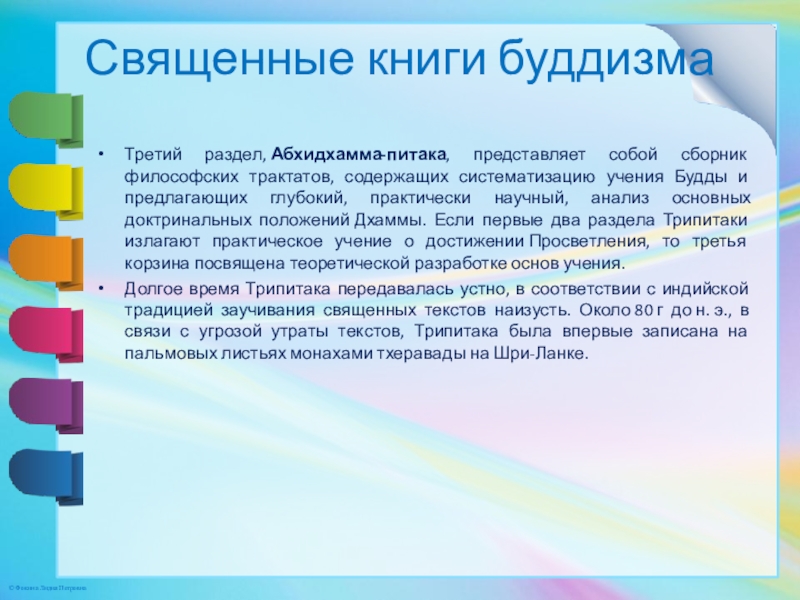 систематизацию учения Будды и предлагающих глубокий, практически научный, анализ основных доктринальных положений Дхаммы. Если первые два раздела Трипитаки излагают практическое учение о достижении Просветления, то третья корзина посвящена теоретической разработке основ учения.