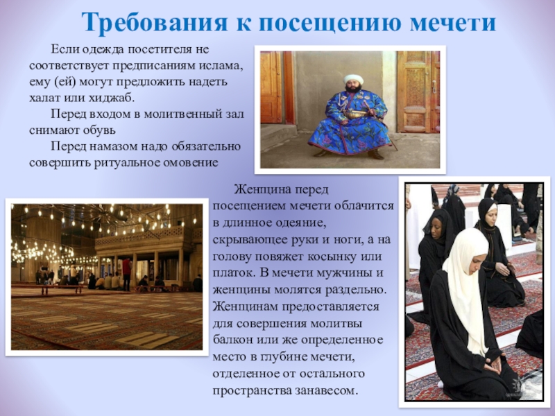 Женщина перед посещением мечети облачится в длинное одеяние, скрывающее руки и ноги, а на голову повяжет косынку или платок. В мечети мужчины и женщины молятся раздельно. Женщинам предоставляется для совершения молитвы балкон или же определенное место в глубине мечети, отделенное от остального пространства занавесом.