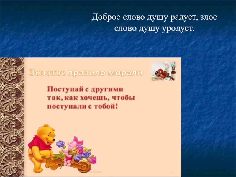Слайд 1Доброе слово душу радует, злое слово душу уродует.