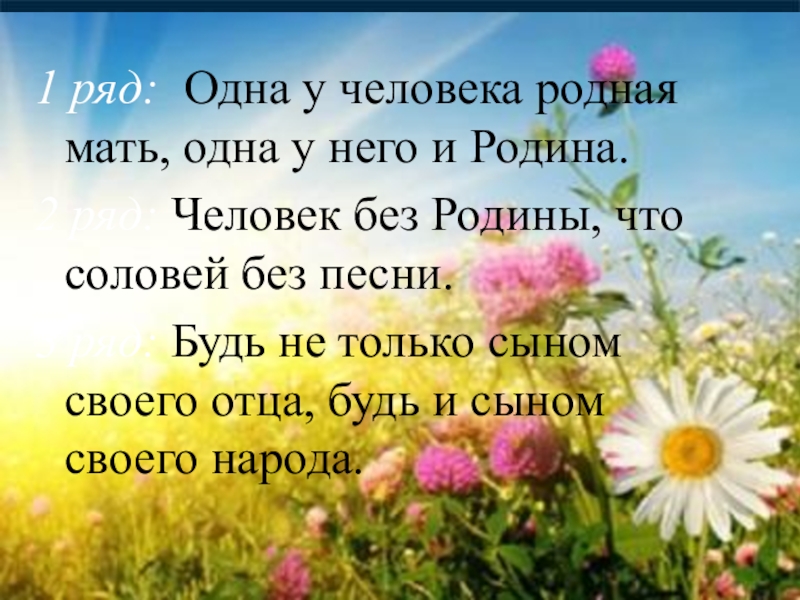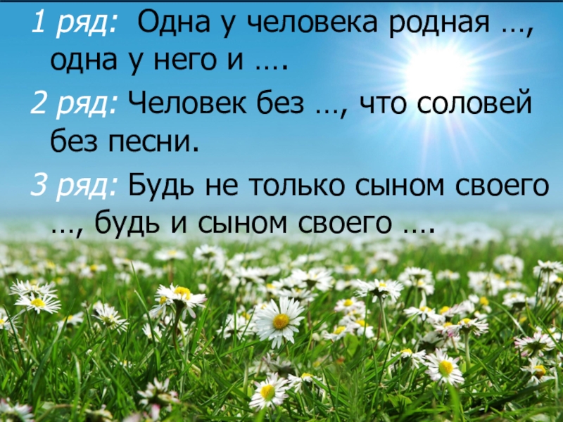 1 ряд:  Одна у человека родная мать, одна у него и Родина.2 ряд: Человек без Родины, что