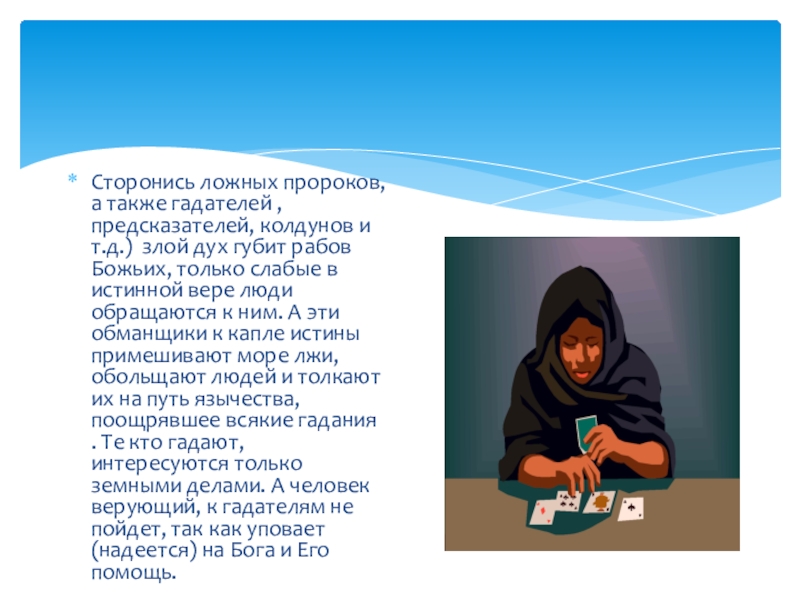Слайд 11Сторонись ложных пророков, а также гадателей , предсказателей, колдунов и т.д.)