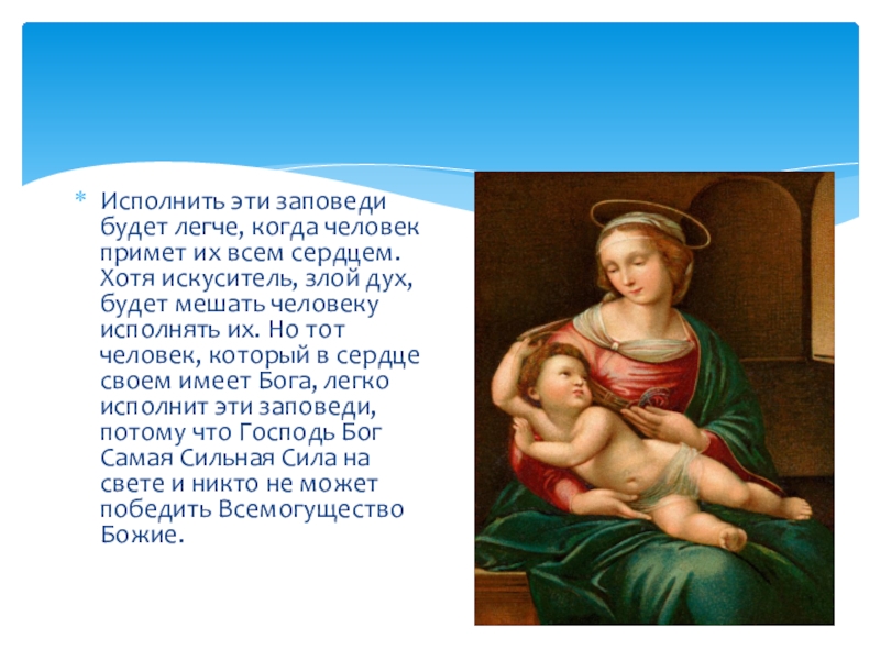 Слайд 13Исполнить эти заповеди будет легче, когда человек примет их всем сердцем.