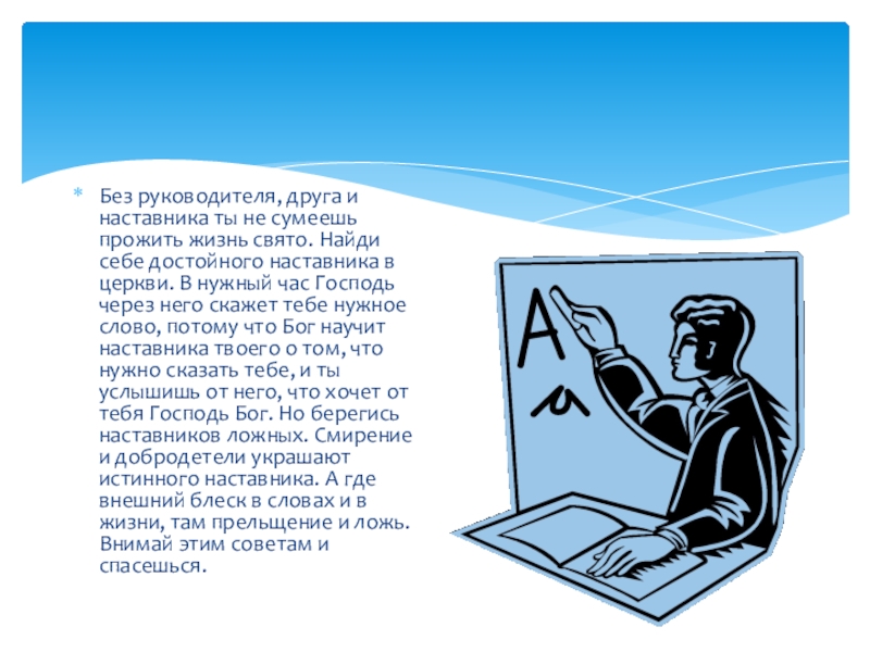 Найди себе достойного наставника в церкви. В нужный час Господь через него скажет тебе нужное слово, потому что Бог научит наставника твоего о том, что нужно сказать тебе, и ты услышишь от него, что хочет от тебя Господь Бог. Но берегись наставников ложных. Смирение и добродетели украшают истинного наставника. А где внешний блеск в словах и в жизни, там прельщение и ложь. Внимай этим советам и спасешься.