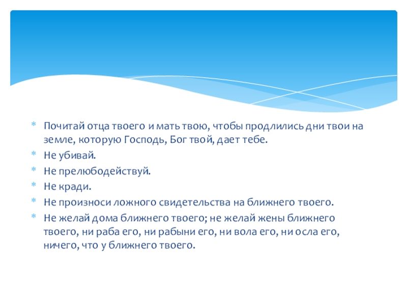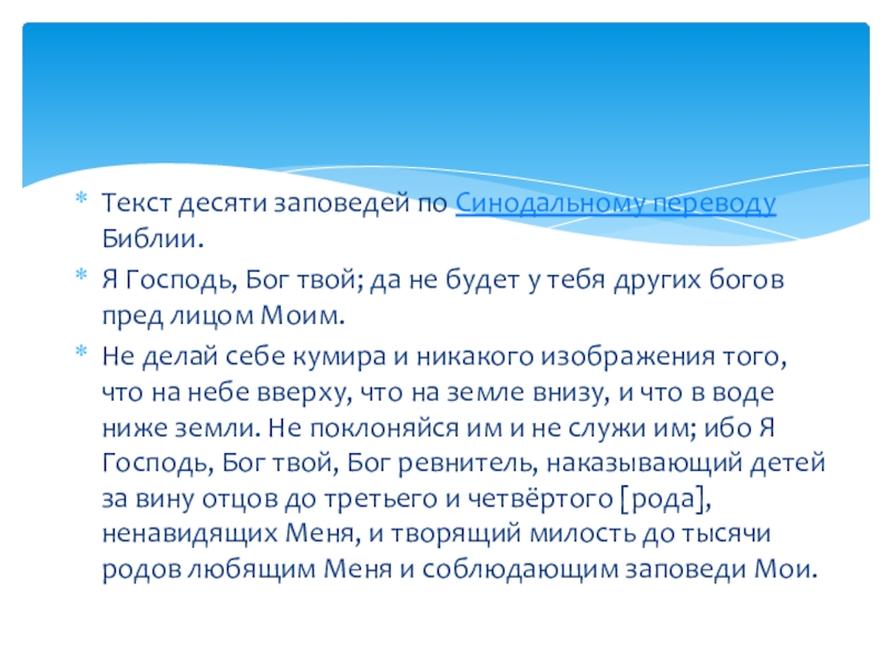 Слайд 15Текст десяти заповедей по Синодальному переводу Библии.