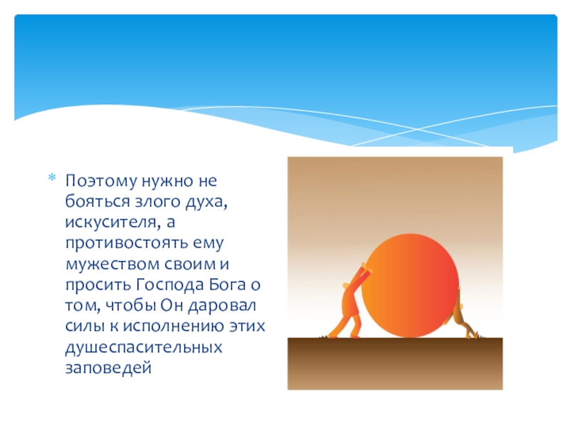 Слайд 14Поэтому нужно не бояться злого духа, искусителя, а противостоять ему мужеством