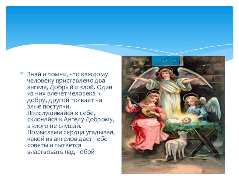 Слайд 10Знай и помни, что каждому человеку приставлено два ангела, Добрый и