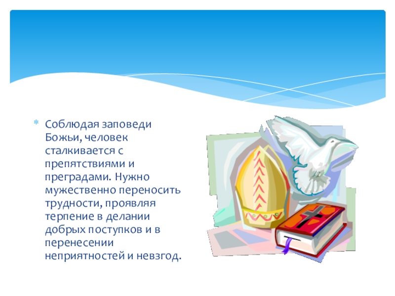 Слайд 9Соблюдая заповеди Божьи, человек сталкивается с препятствиями и преградами. Нужно мужественно