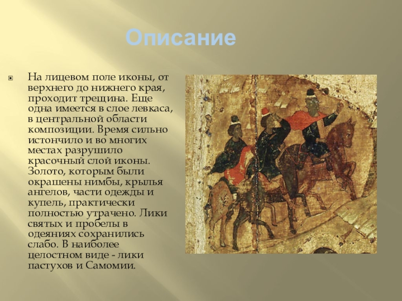 ОписаниеНа лицевом поле иконы, от верхнего до нижнего края, проходит трещина. Еще одна имеется в слое левкаса,