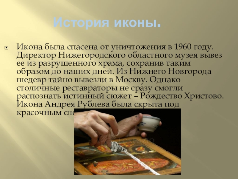 областного музея вывез ее из разрушенного храма, сохранив таким образом до наших дней. Из Нижнего Новгорода шедевр тайно вывезли в Москву. Однако столичные реставраторы не сразу смогли распознать истинный сюжет – Рождество Христово. Икона Андрея Рублева была скрыта под красочным слоем 19-го века.