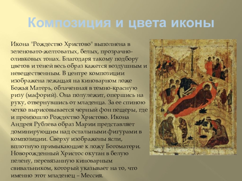 прозрачно-оливковых тонах. Благодаря такому подбору цветов и теней весь образ кажется воздушным и невещественным. В центре композиции изображена лежащая на киноварном ложе Божья Матерь, облаченная в темно-красную ризу (мафорий). Она полулежит, опершись на руку, отвернувшись от младенца. За ее спиною четко вырисовывается черный фон пещеры, где и произошло Рождество Христово. Икона Андрея Рублева образ Марии представляет доминирующим над остальными фигурами в композиции. Сверху изображены ясли, вплотную примыкающие к ложу Богоматери. Новорожденный Христос окутан в белую пелену, перевязанную киноварным свивальником, который указывает на то, что именно этот младенец – Мессия.