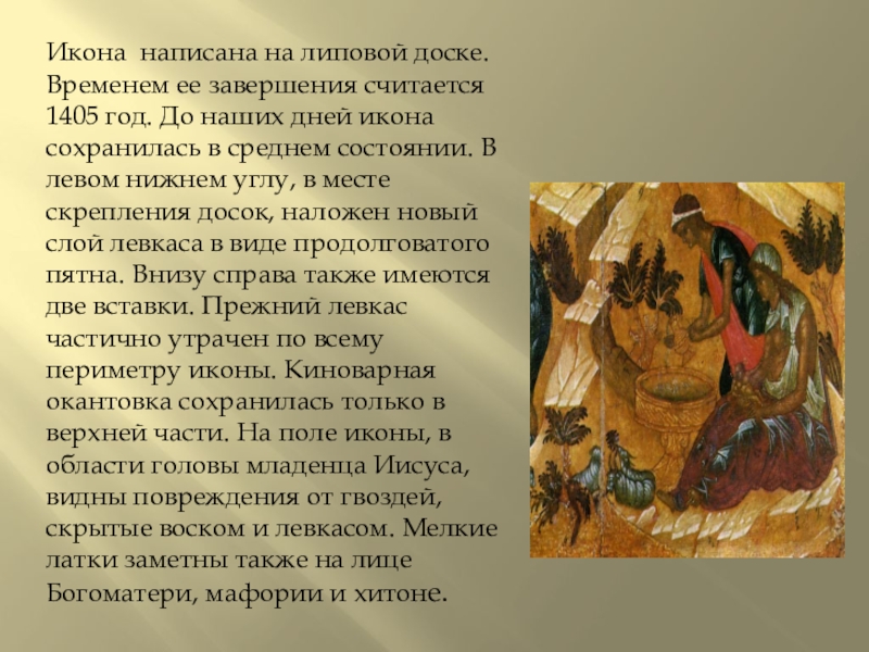 Слайд 3Икона написана на липовой доске. Временем ее завершения считается 1405 год.