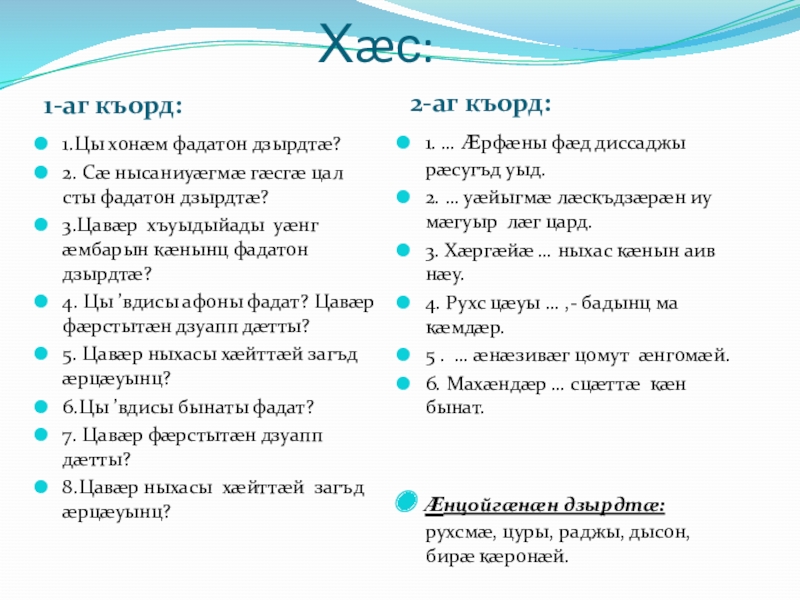 ᴁнцойгæнæн дзырдтæ: рухсмæ, цуры, раджы, дысон, бирæ кæронæй.