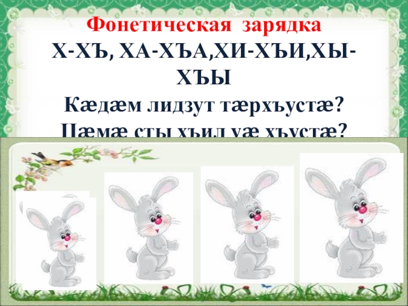 Слайд 2 Фонетическая зарядка Х-ХЪ, ХА-ХЪА,ХИ-ХЪИ,ХЫ-ХЪЫ Кæдæм лидзут тæрхъустæ? Цæмæ сты хъил уæ хъустæ?