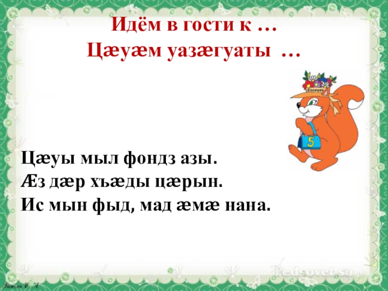 Идём в гости к … Цæуæм уазæгуаты …Цæуы мыл фондз азы.Æз дæр хъæды цæрын.Ис мын фыд, мад